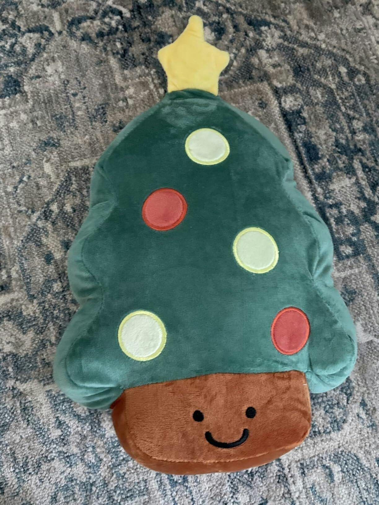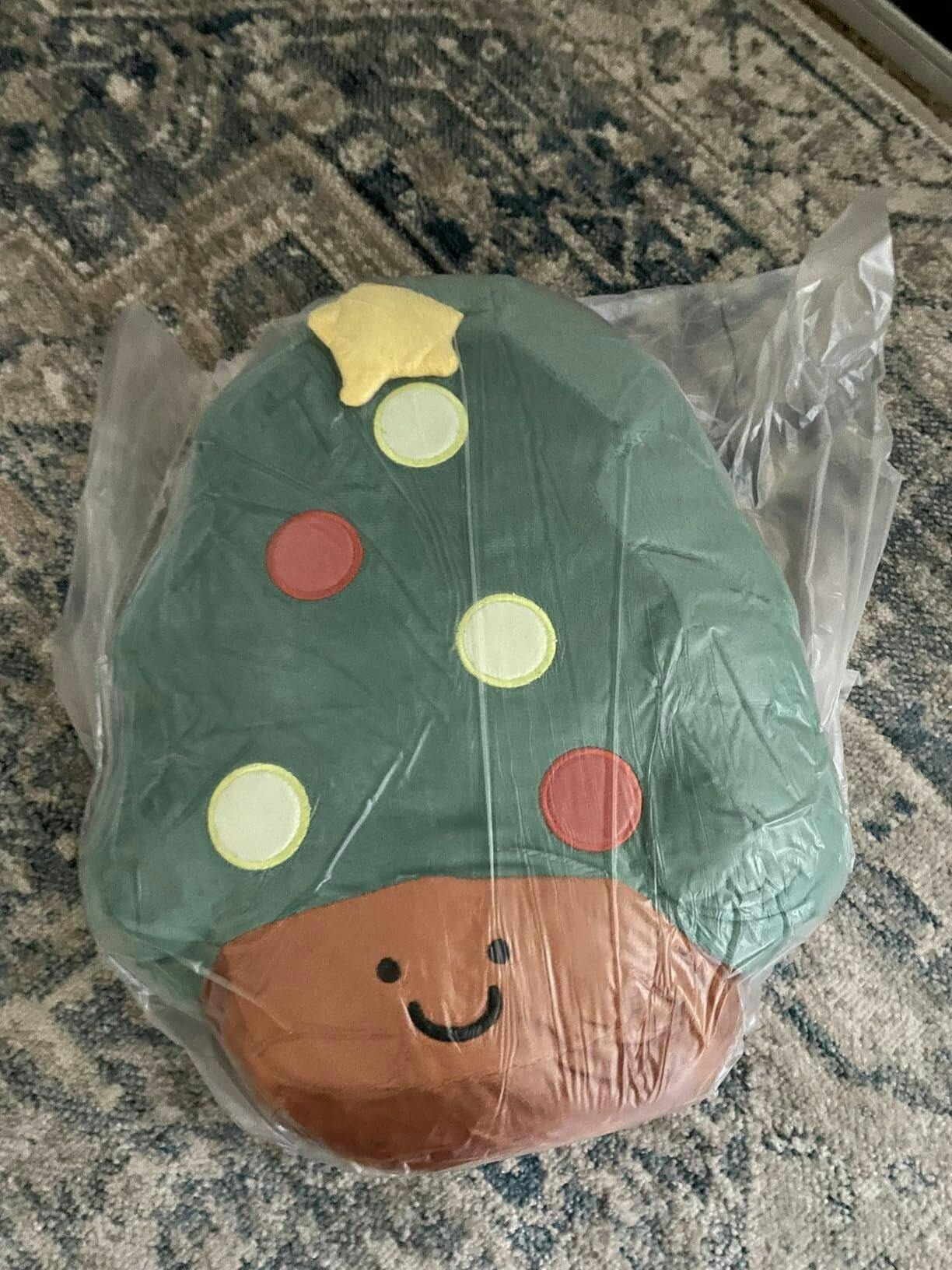 This Christmas pillow is cute, soft, a nice size and would make a fun Christmas present. It comes slightly compressed in the packaging but fills out fairly quickly after opening. However, the stitching on the back side isn’t great. Right out of the package, I could see that it was already coming loose and had a small hole forming. The star at the top also falls forward as won’t stay upright. I’m going to try and close up the hole but for this price, I would expect better quality stitching.